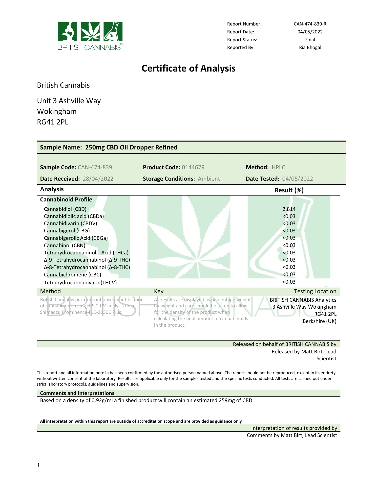 Lab Reports / Certificate of Analysis